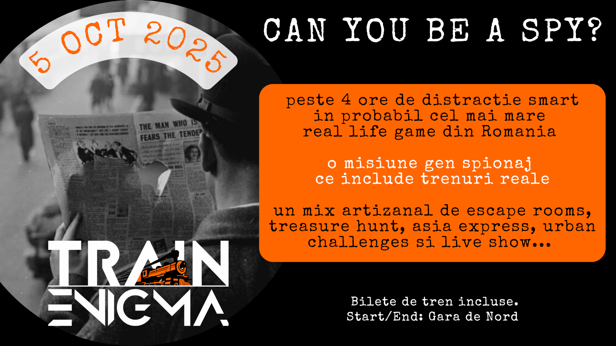 TRAIN ENIGMA nu este doar un joc; este o misiune de tip spionaj, desfășurată în trenuri aflate în mișcare, într-o aventură de peste 4 ore care începe și se termină în București. Unele ediții se desfășoară și în alte orașe din țară – urmărește secțiunea Evenimente.